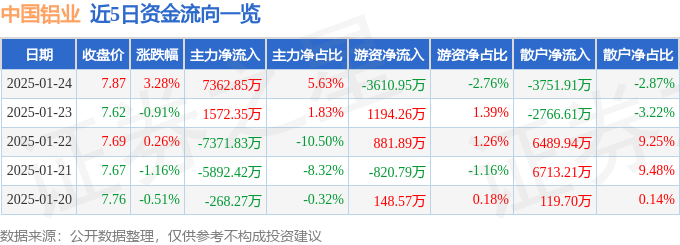 本站消息,截至2025年1月24日收盘,中国铝业(601600)报收于7.87元,上涨3.28%,换手率1.28%,成交量168.47万手,成交额13.07亿元。